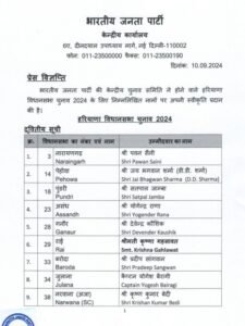 इस सूची में नारायणगढ़ से पवन सैनी, पेहोवा से जय भगवान शर्मा, जुलाना से कैप्टन योगेश बैरागी को टिकट दिया गया है। कैप्टन की सीधी टक्कर कांग्रेस उम्मीदवार विनेश फोगाट से होगीचार सितंबर को भारतीय जनता पार्टी ने विधानसभा चुनाव के लिए पहली सूची जारी की थी। इस सूची में मुख्यमंत्री नायब सैनी का नाम भी था। वह कुरुक्षेत्र की लाडवा सीट से विधानसभा चुनाव लड़ेंगे। ।
